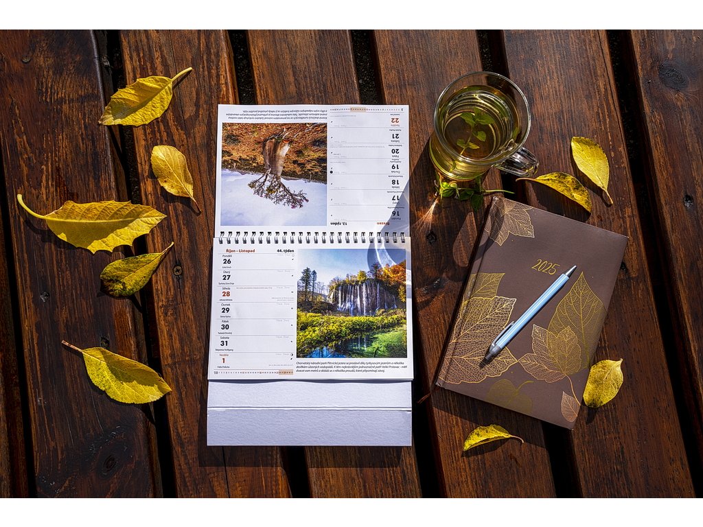 Stolní kalendář o velikosti A5 obsahuje 54 stran včetně strany titulní a je vytištěn na kvalitním křídovém papíře.